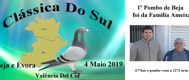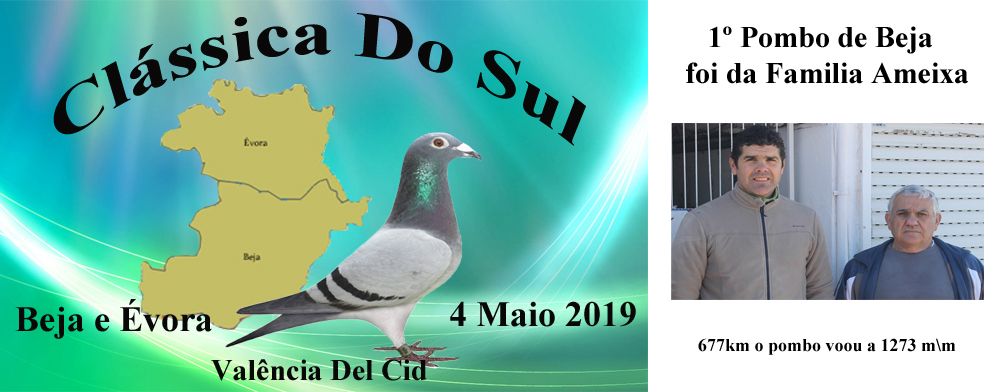 O primeiro pombo do Distrito de Beja no nacional de Valência 2019 e na Clássica do Sul, disputada entre os distritos de Évora e Beja foi o Pombo da Família Ameixa que voou os 677 Kms a 1273 m\m. Parabéns por mais um feito alcançado por esta família.