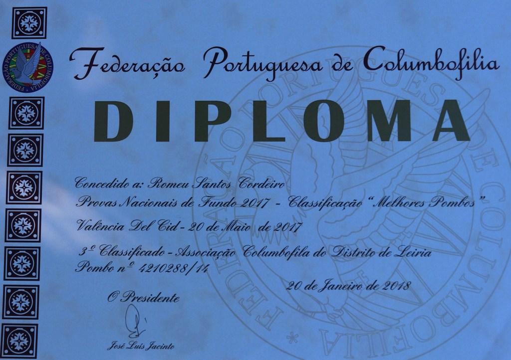 Esse macho é acasalado com um pomba pedrada do columbofilo Verdelho de uma localidade junto a Santarém, de onde nasce um único pombo nesse ano… logo no seu primeiro concurso, arranca um 1º prémio… no segundo concurso outra vez 1º inclusive distrital…será sorte? pensou o columbofilo… é encestado novamente e nunca mais regressa… mas ficou a ideia e a esperança… o casal é feito novamente no ano seguinte e já são anilhados vários borrachos… o macho do casal foi experimentado com varias parceiras e com todas deu bons filhos… foi baptizado de “Pena”… e continua a ser a grande base da colónia. Todos os anos nascia um craque deste grande reprodutor, enquanto ele foi fértil… com o passar dos anos foram feitos alguns consanguíneos para preservar a linhagem. Assim nasce um grande reprodutor…