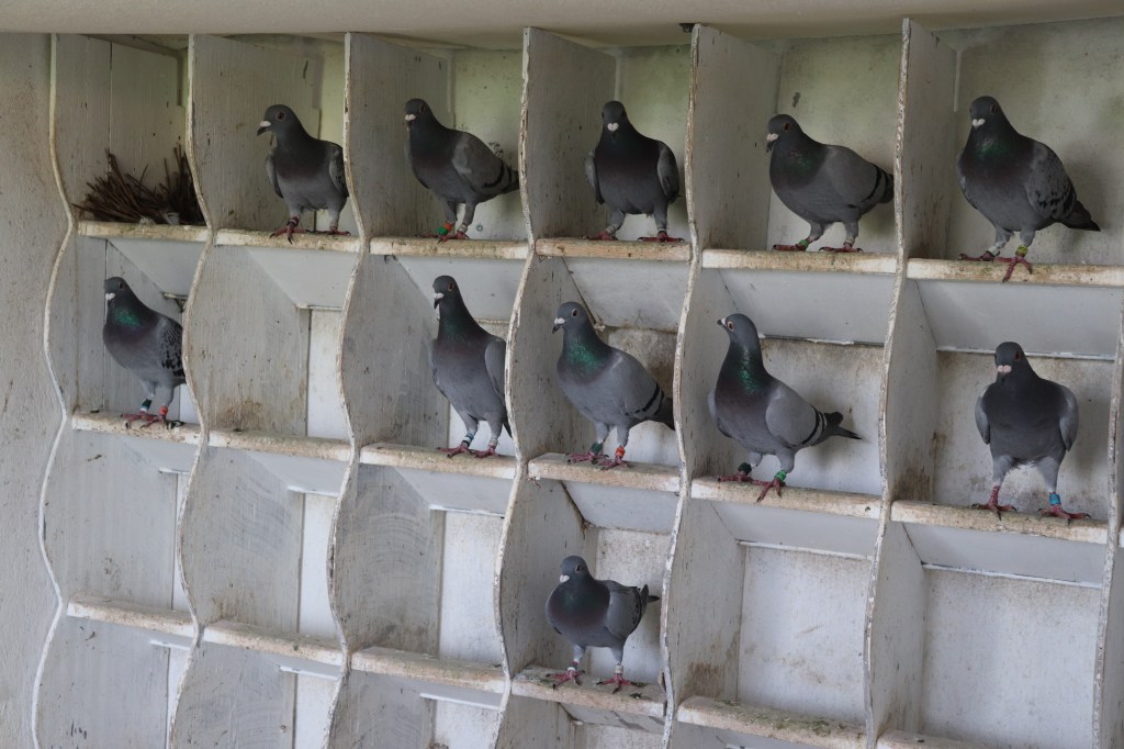 As instalações são compostas por uma secção de entrada, local utilizado no final da campanha para acasalamento, mas durante os concursos nem machos nem fêmeas ai permanecem, entram depois do treino diário e vão fazer a refeição e abeberamento ja na sua respectiva secção. Existe uma para fêmeas e outra para os machos, para completar o ramalhete, em local separado podemos observar dois pombais para os reprodutores, onde pudemos entrar e manusear alguns pombos de grande qualidade. Neste espaço coabitam cerca de 14 casais.