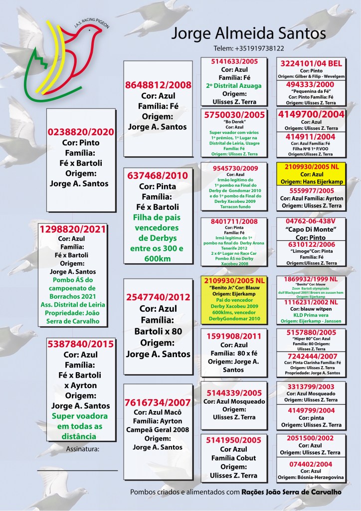 Na parte pai podem verificar no pedigree temos o casal ‘’Capo DI Monte“ X ‘’Limoge’’ de origem Luso Germânica adquiridos a preços modestos , ficando os seus descendentes com um valor acima da média como exemplo o “Albator jr” “Inchabod” ” Lexy” “Paca” “Cherokee chief” “Aruck Taruck” entre outros que foram adquiridos por vários columbofilos de várias nacionalidades!