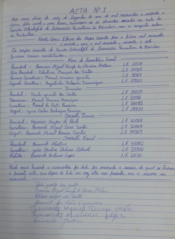Deixamos a foto da primeira ata do Clube das Meirinhas, onde podemos contemplar todos os sócio fundadores pertencentes aos corpos sociais. O delfim Oliveira está ligado ao clube desde o seu inicio. Começou pelo concelho técnico onde esteve vários anos, depois foi para o Conselho Fiscal e agora é o presidente atual da direção.